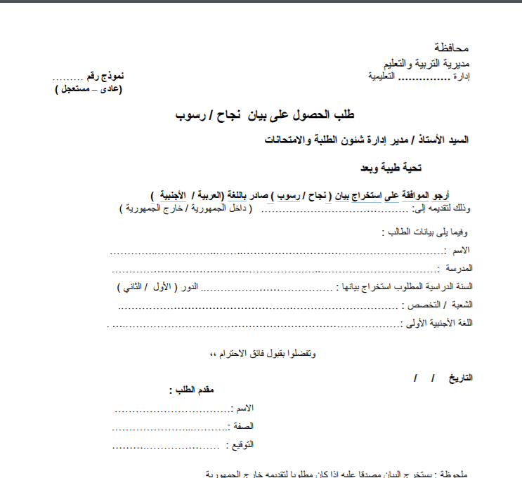 نموذج طلب استخراج بيان نجاح أو رسوب للطباعه Pdf