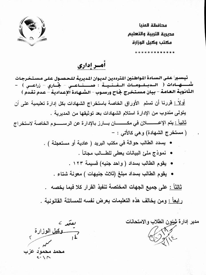 تيسيرا على الجميع مستخرج الشهادات العامة ثانوى صناعى زراعى ومستخرج نجاح ورسوب بالإدارت التعليمية بدلا من المديرية