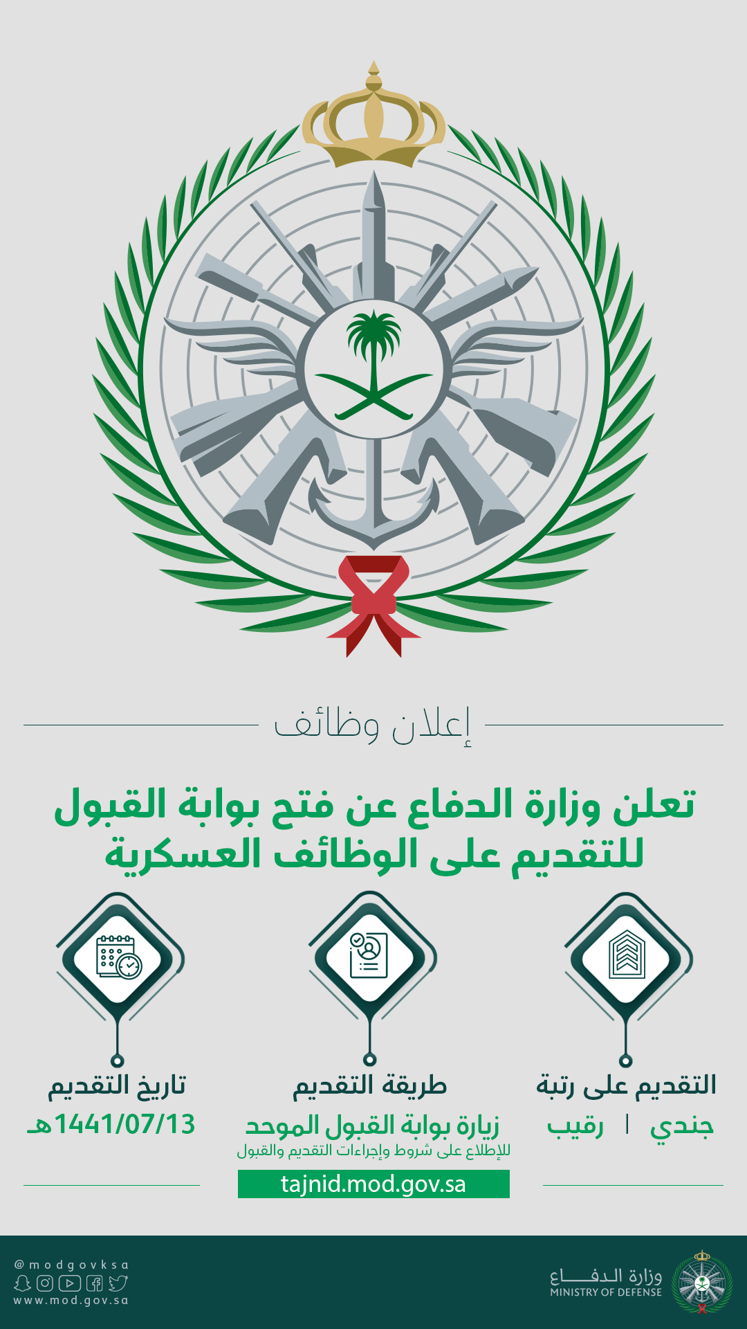 وزارة الدفاع Auf Twitter تعلن وزارة الدفاع عن فتح بوابة القبول والتجنيد الموحد للقوات المسلحة وأفرعها وبرامج الإبتعاث الخارجي للإلتحاق في الخدمة العسكرية من رتبة جندي إلى رتبة رقيب Https T Co J9naabi8zd Https T Co Awscq1xmbr