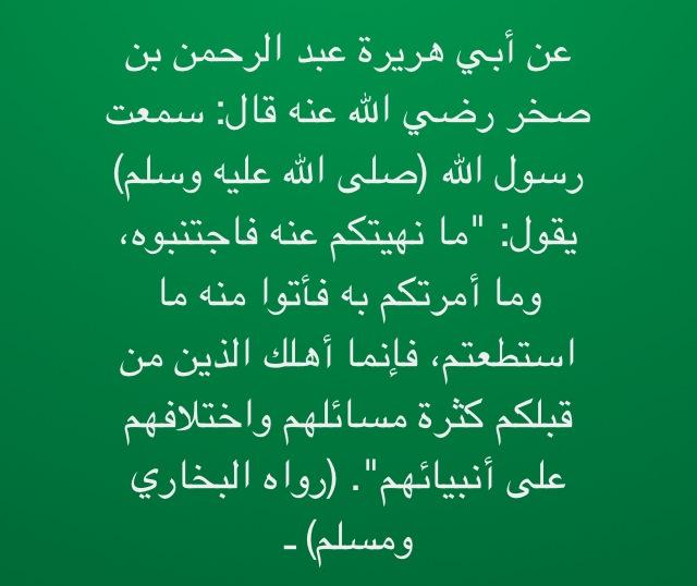 احاديث عن أبي هريرة عبد الرحمن بن صخر رضي الله عنه قال سمعت رسول الله صلى الله عليه وسلم يقول ما نهيتكم عنه فاجتنبوه وما أمرتكم به Ahadith Alae Nlp